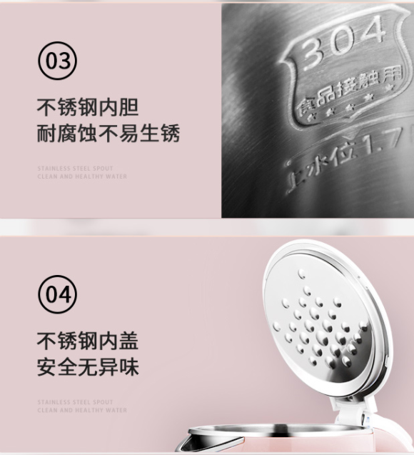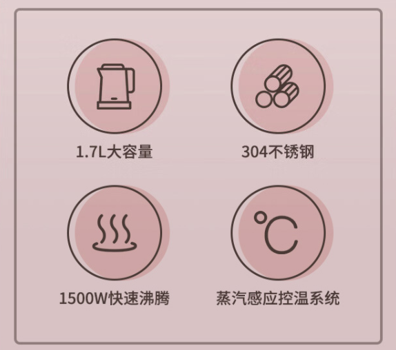 規(guī)格參數(shù)產(chǎn)品尺寸長198mm;寬153mm;高218mm額定功率1500W產(chǎn)品凈重1kg電源線長0.7m額定電壓220V功能參數(shù)適用場景家用主體參數(shù)認(rèn)證型號WHJ1705b容量1.7L顏色粉色包裝清單電水壺x1,電源底座x1,說明書保修卡x1,包裝箱x1